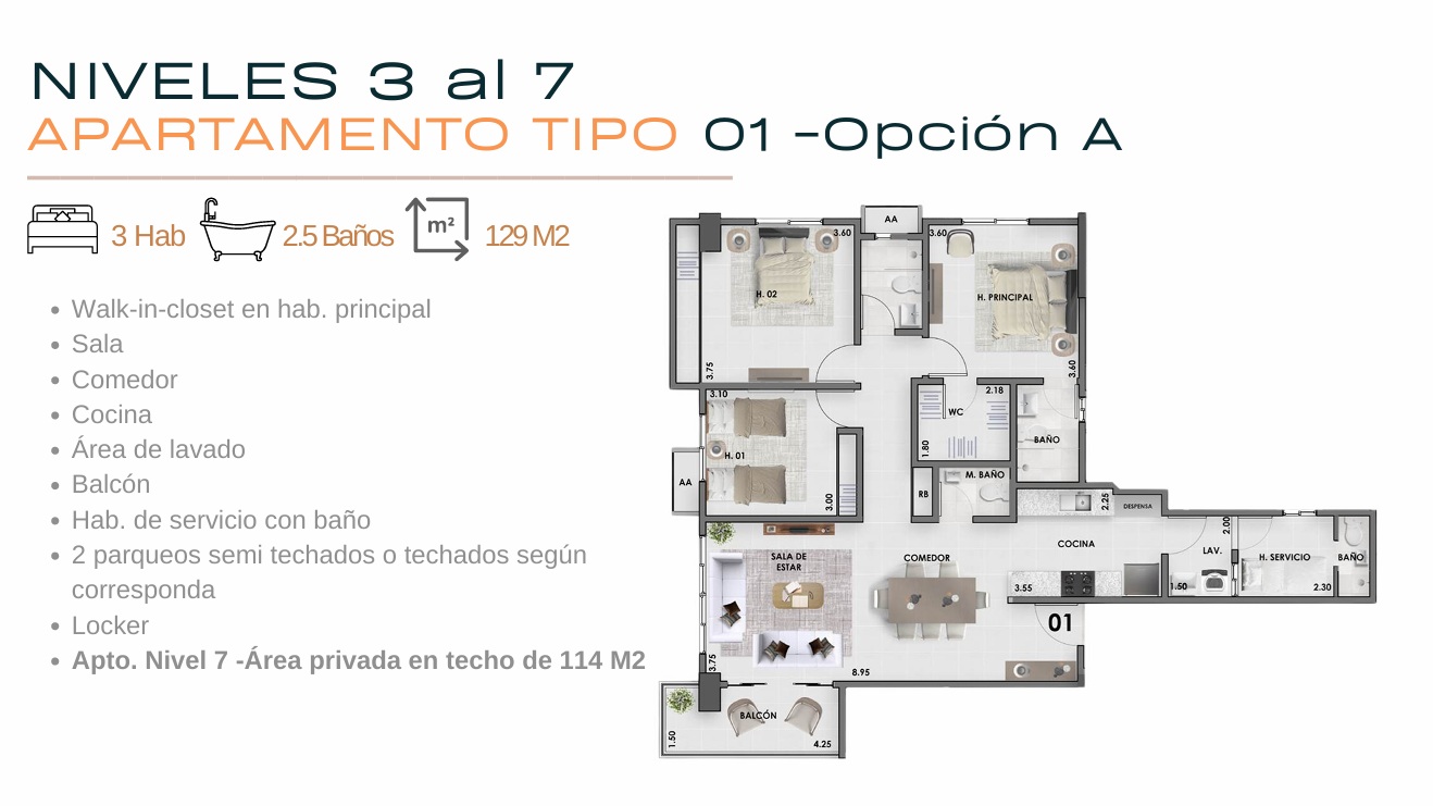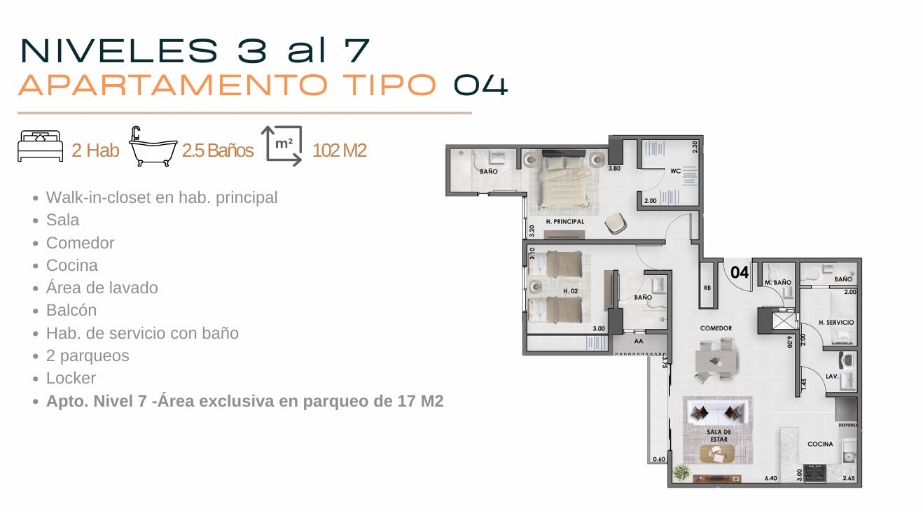 – TENEMOS APTOS. DE 79mts. A 155mts.: CONSTAN DE 2 HABS. CON 2 O 2.5 BAÑOS Y DE 3 HABS. CON 2.5 BAÑOS, TODAS CON BALCÓN Y LOCKER, LOS APTOS. ESTÁN DEL 2do. AL 6to. NIVEL, TIENEN 1 Y 2 PARQUEOS, ALGUNOS APTOS. TIENEN WALK IN CLOSET EN HAB. PRINCIPAL Y HAB. DE SERVICIO CON BAÑO.